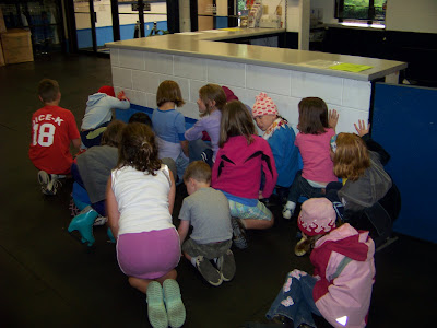 Sarah thought we were going to look for light fixtures when we all climbed into the minivan. We had just told Charlie, but Allison and David didn't know until we got inside and I told them to crouch down and yell "Surprise!" when Sarah walked in. While we were in the car, I untied Sarah's shoelace, so when we parked I brought Charlie, Allison, and David inside while Daddy waited for Sarah to re-tie her shoe. Somehow, she didn't find any of this strange. But when she got inside ... BOY was she surprised!